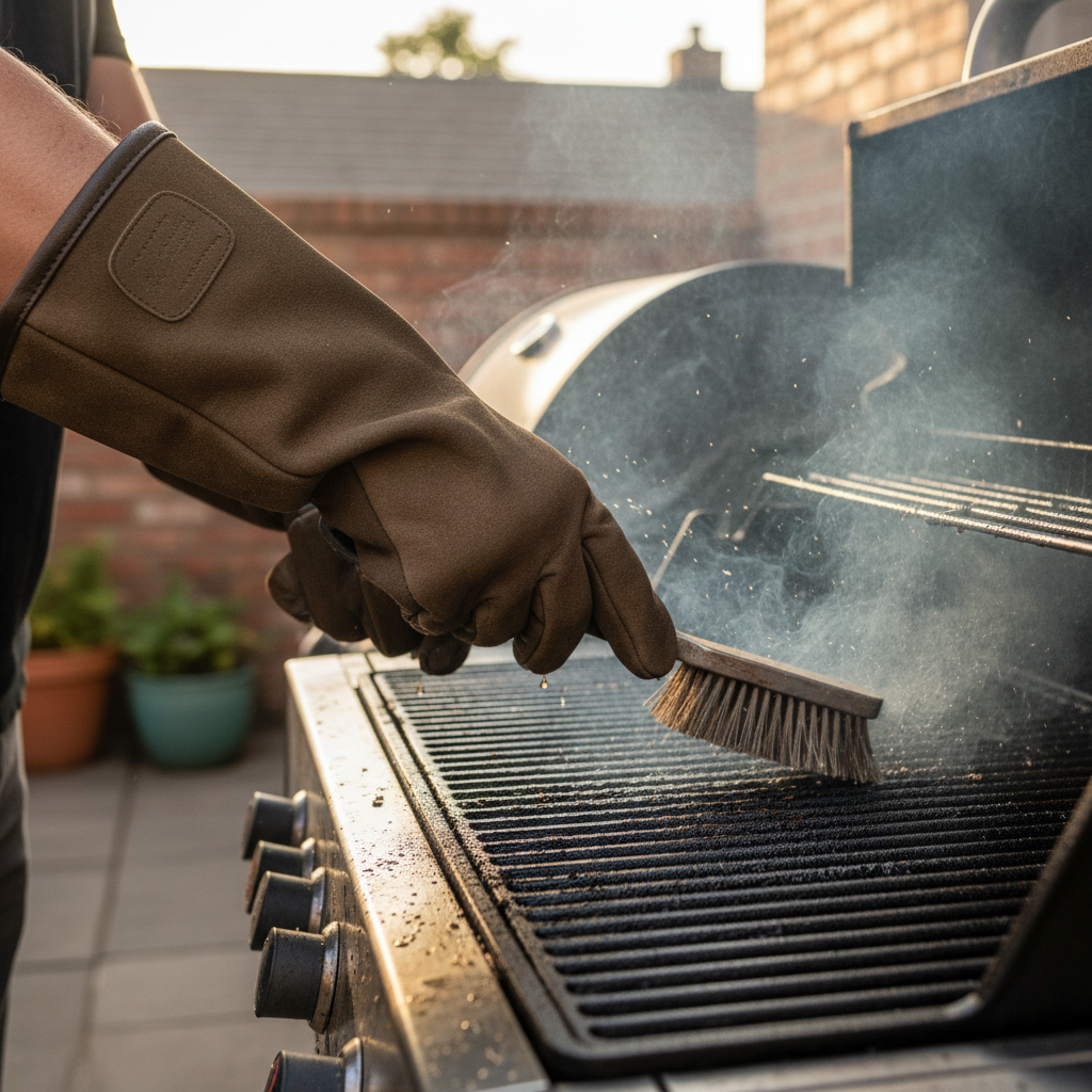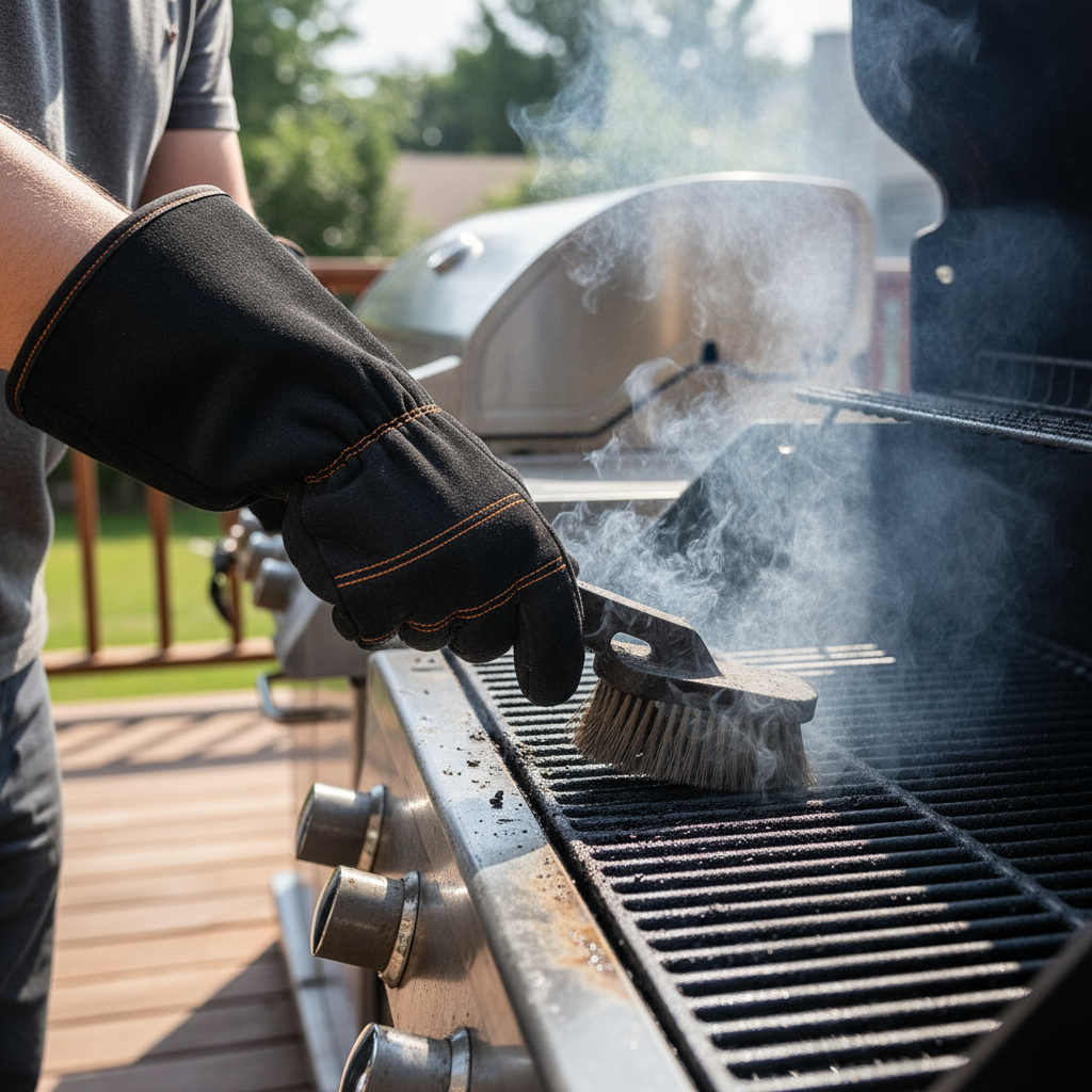 When you’re dealing with a grill that’s still warm and using a sturdy scraper or brush, you need maximum heat protection combined with good grip. Heavy-duty, long-cuffed silicone or aramid fiber gloves are ideal. Pair them with a robust cleaning tool like the Grill Rescue Brush (bristle-free) for effective cleaning without metal bristles.